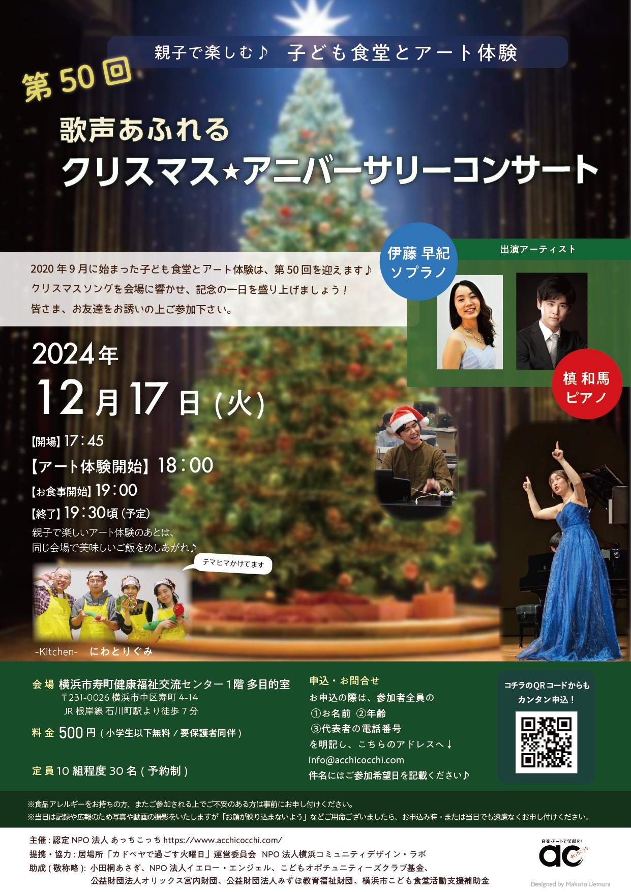 2020年9月に始まった子ども食堂とアート体験は、みなさんのおかげで第50回目の開催となります👏 記念の1日には皆さんへの感謝の気持ちをこめ、初登場のソプラノ歌手: 伊藤早紀さん、ピアニストの槙和馬さんの演奏と一緒に素敵なクリスマスソングを会場に響かせ、にわとりぐみの美味しいお料理でパーティー気分を味わいましょう🥳